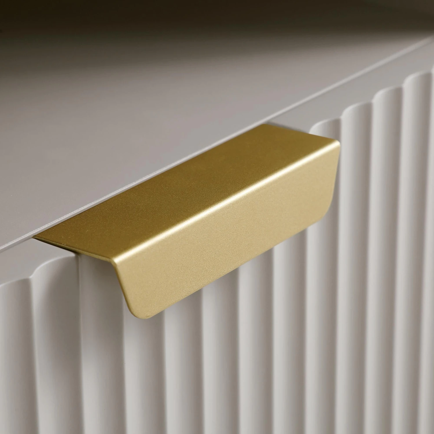 • The 120 cm wide TV unit features ribbed front finished in matte taupe paint, completed with contrasting gold effect handles and legs.